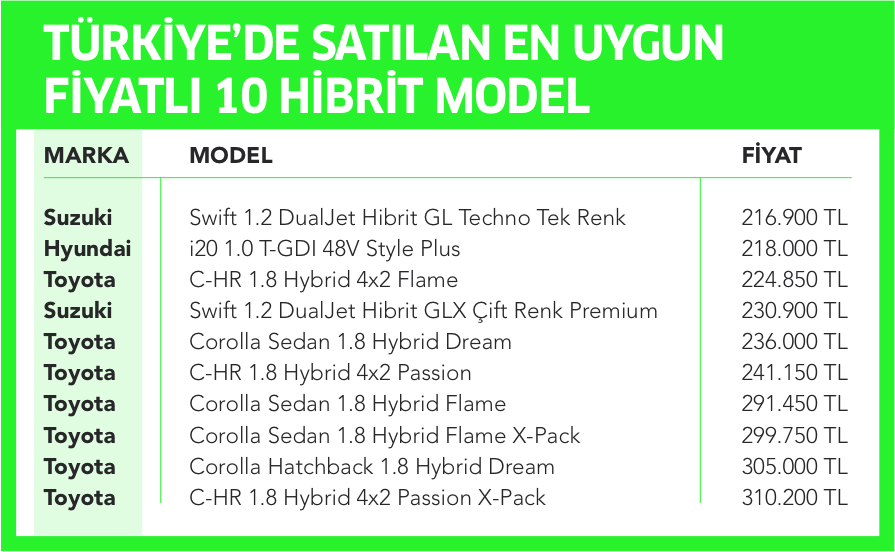 Gün geçmiyor ki otomotiv markaları hibrit model bir araç tanıtımı yapmasın. Yatırımların ve vatandaşların hibrit modellere olan ilgisinden yola çıkan veri şirketi Cardata, Türkiye satılan en uygun fiyatlı 10 hibrit otomobil hakkında liste yaptı. Konuyla ilgili açıklama yapan Cardata Genel Müdürü Hüsamettin Yalçın, “Türkiye’de 15 farklı markanın 29 farklı hibrit ve elektrikli modeli satışa sunuluyor. Bu modellerin pazardaki payı her geçen sene artırıyor. 2020’nin Ocak-Ekim döneminde hibrit ve elektrikli araçların toplam binek araçlar pazarındaki payı yüzde 3,2 olarak dikkatleri çekti. Bu oranın 2021 yılında yüzde 6’ya ulaşmasını bekliyoruz” dedi.