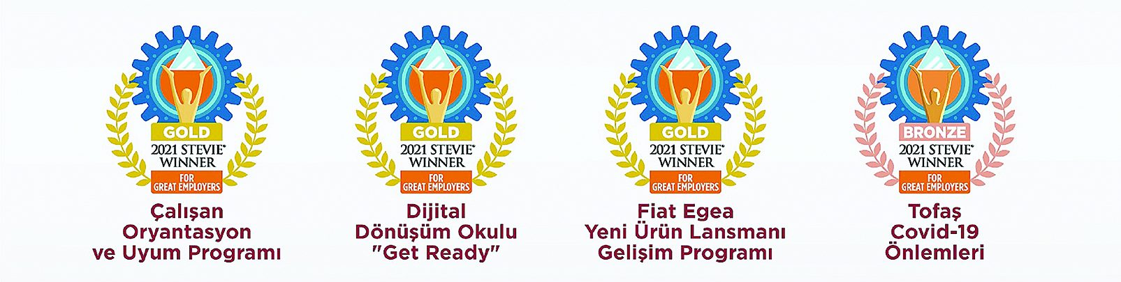 Şirket, her yıl 70’i aşkın ülkeden 10 binin üzerinde başvuru alan Stevie Uluslararası İş Ödülleri’nde “Çalışan Oryantasyon ve Uyum Programı’, Dijital Dönüşüm Okulu -Get Ready- ve ‘Fiat Egea Yeni Ürün Lansmanı Gelişim Programı” ile altın, “Covid-19 Önlemleri”yle de bronz ödülün sahibi oldu.