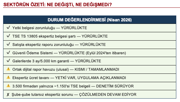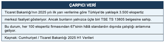 Yönetmelik, ekspertiz raporlarının yalnızca TSE’nin TS 13805 standardına göre verilen Hizmet Yeterlilik Belgesi sahibi işletmeler tarafından düzenlenebileceğini hükme bağladı. Belgesiz firmadan alınan rapor, noter tarafından geçerli sayılmıyor. Öte yandan 2026 yılına kadar tüm ekspertiz noktalarının yetkilendirilmiş yapılar altında toplanması hedeflense de bu süreç hâlâ devam ediyor.
