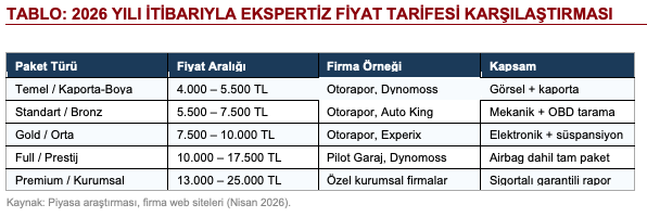 Ekspertiz fiyatlarının 3.500 TL ile 25.000 TL arasında çılgın bir aralıkta seyretmesi, sektörün bir diğer büyük sorunu. 2025 yılında fiyatların yüzde 30-40 arttığı gözlemlenirken, temel paketler 4.000 TL’den başlayıp full paketler 17.500 TL’ye kadar ulaşıyor. Bazı kurumsal firmalardaki özel ‘sigortalı garantili’ paketler ise 25.000 TL’ye dayabiliyor.
